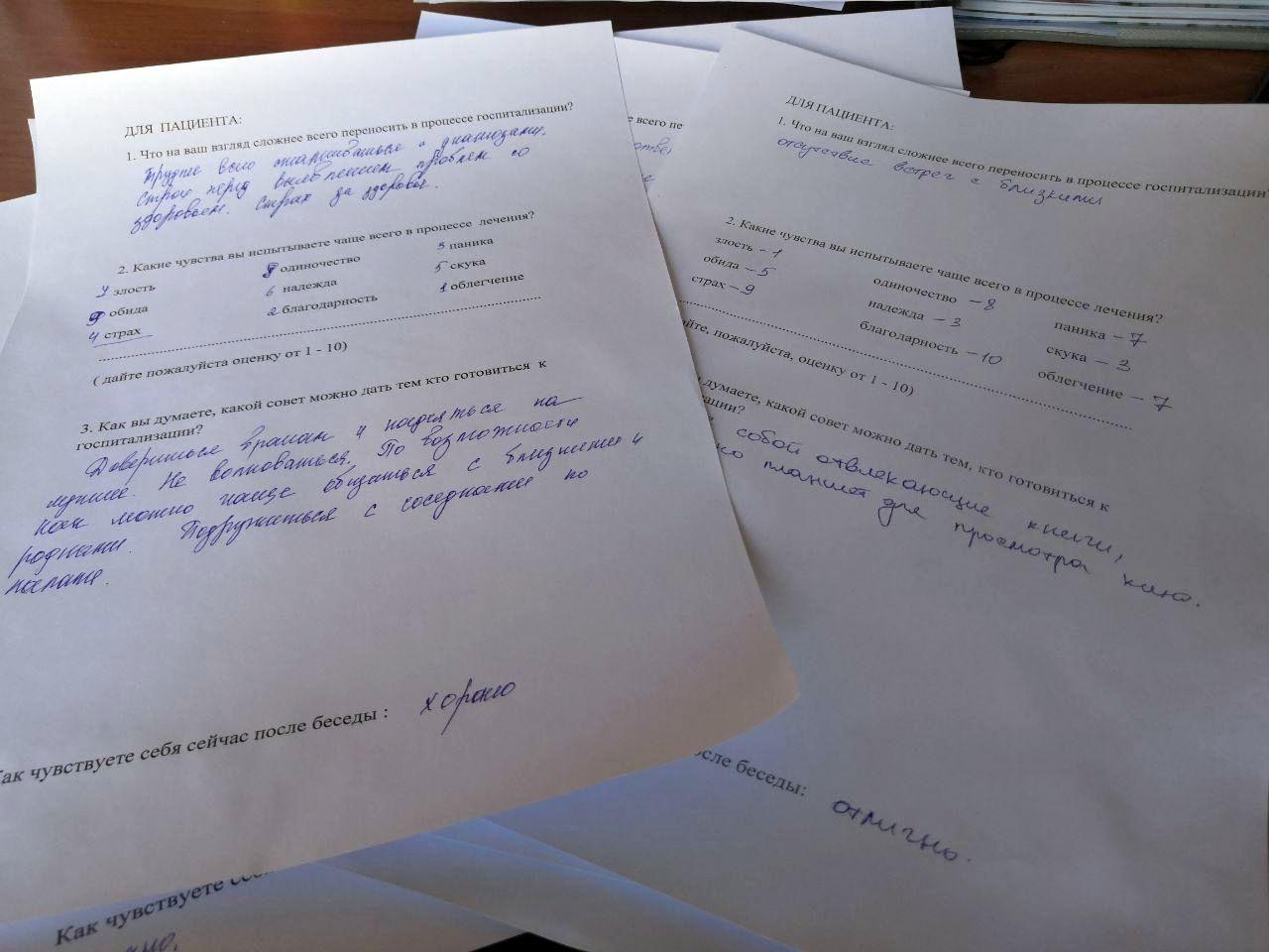 Специально для них в рамках психологической поддержки проходят беседы, а затем пациенты заполняют анкеты, чтобы специалисты больницы могли выявить трудности и помочь находящимся на лечении людям справиться с психологическим напряжением.