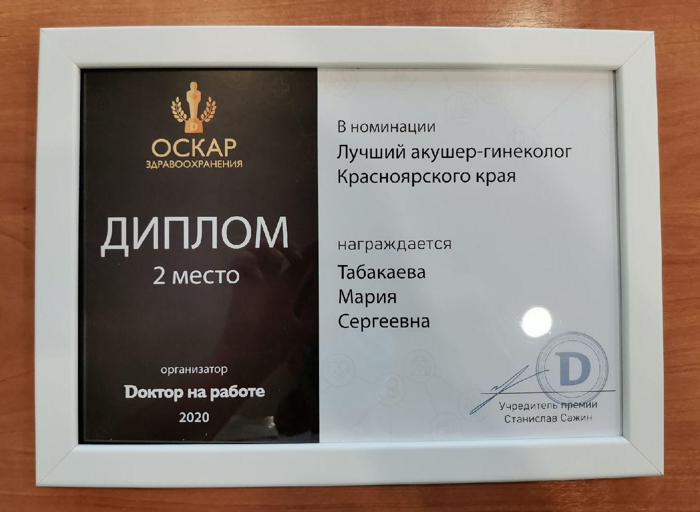 Врач акушер-гинеколог 5 гинекологического отделения КГБУЗ «Красноярская межрайонная клиническая больница №4» Мария Сергеевна Табакаева стала призером премии «Оскар здравоохранения». Она заняла 2 место в номинации «Лучший акушер-гинеколог Красноярского края».