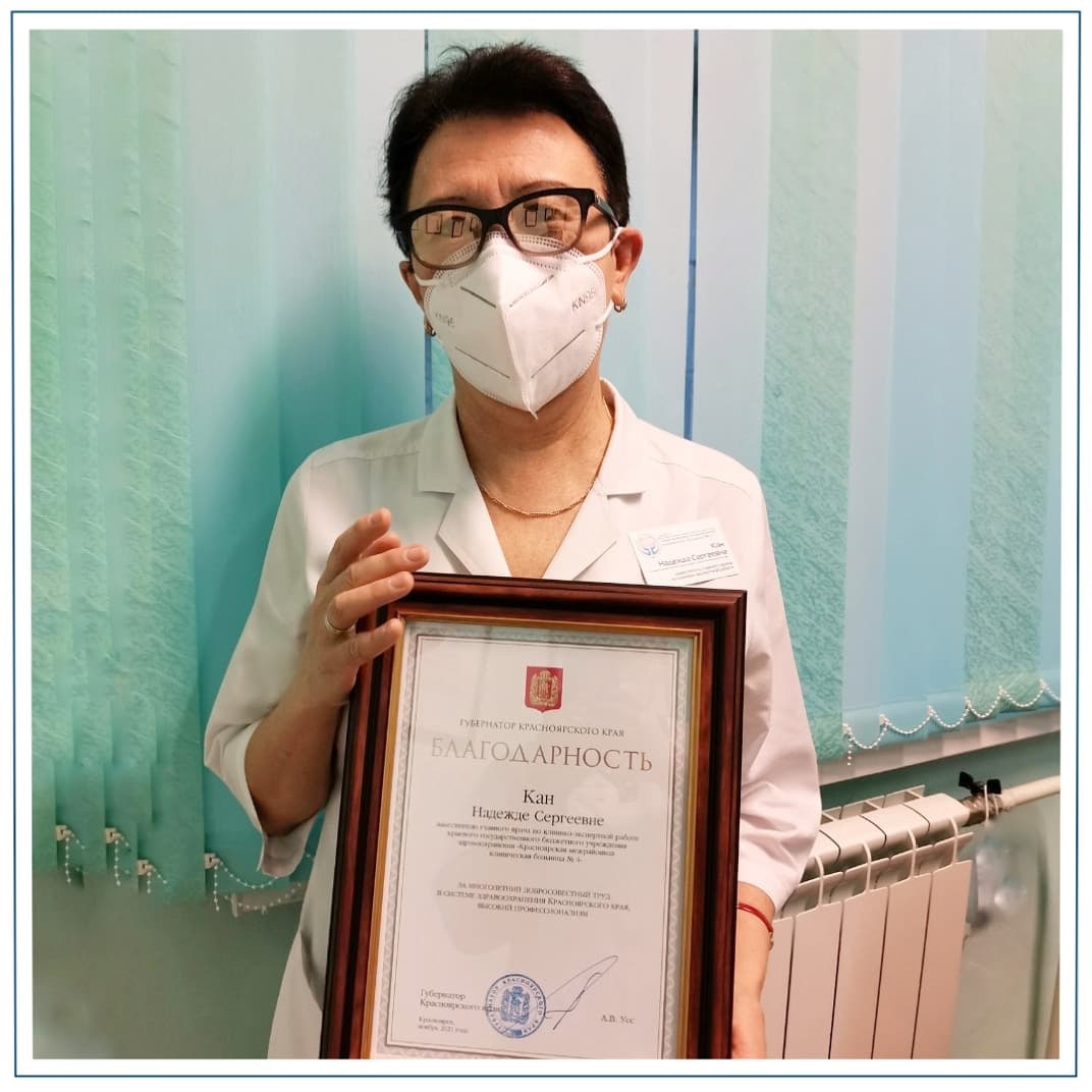 Заместитель главного врача по клинико-экспертной работе, врач-акушер-гинеколог высшей квалификационной категории Надежда Сергеевна Кан удостоена Благодарности Губернатора Красноярского края.