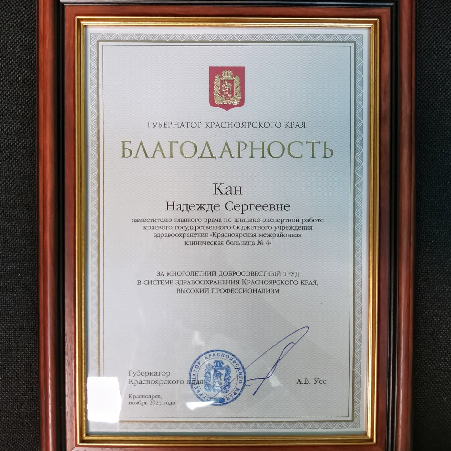 Надежда Сергеевна Кан удостоена Благодарности Губернатора Красноярского края