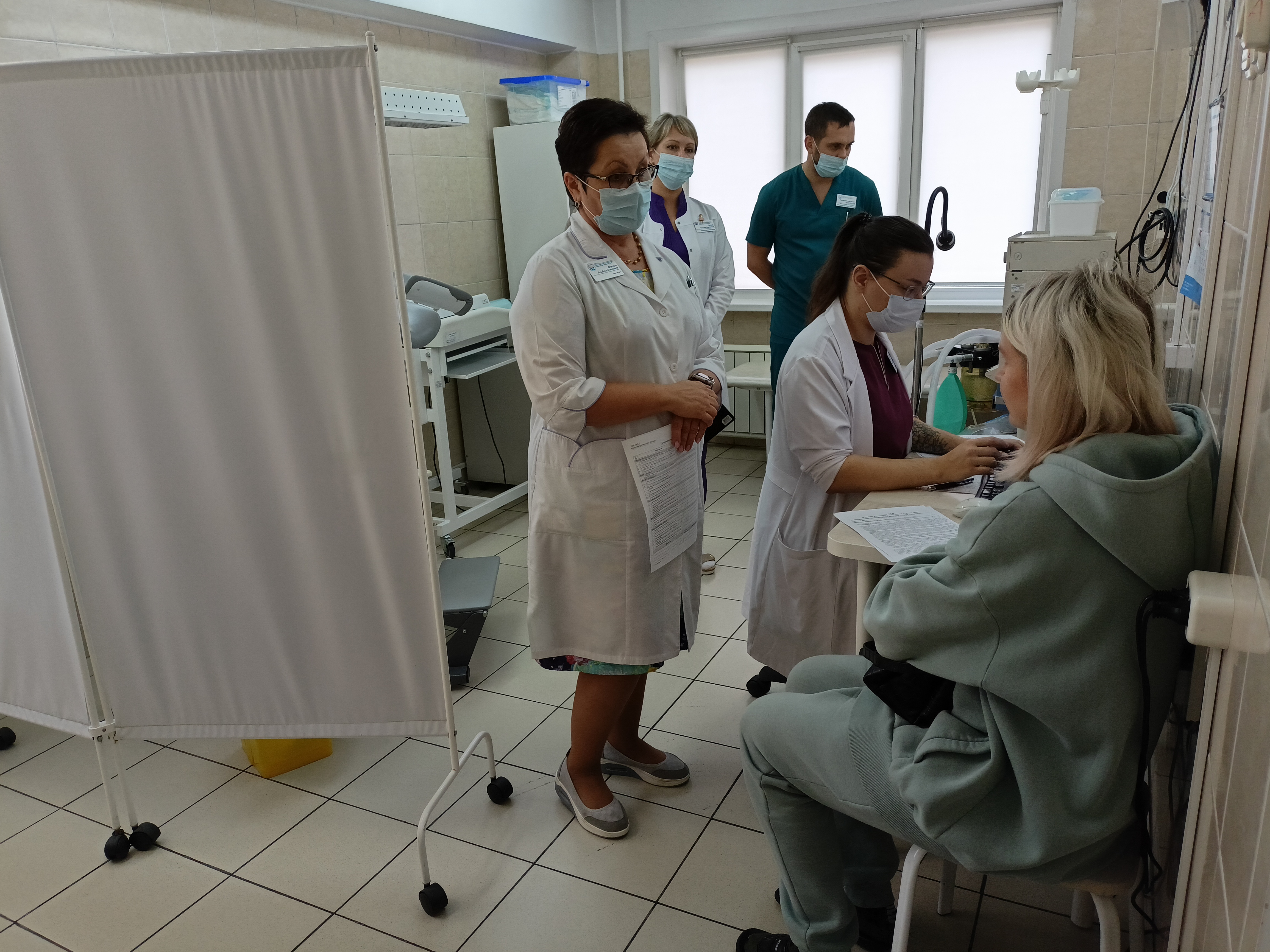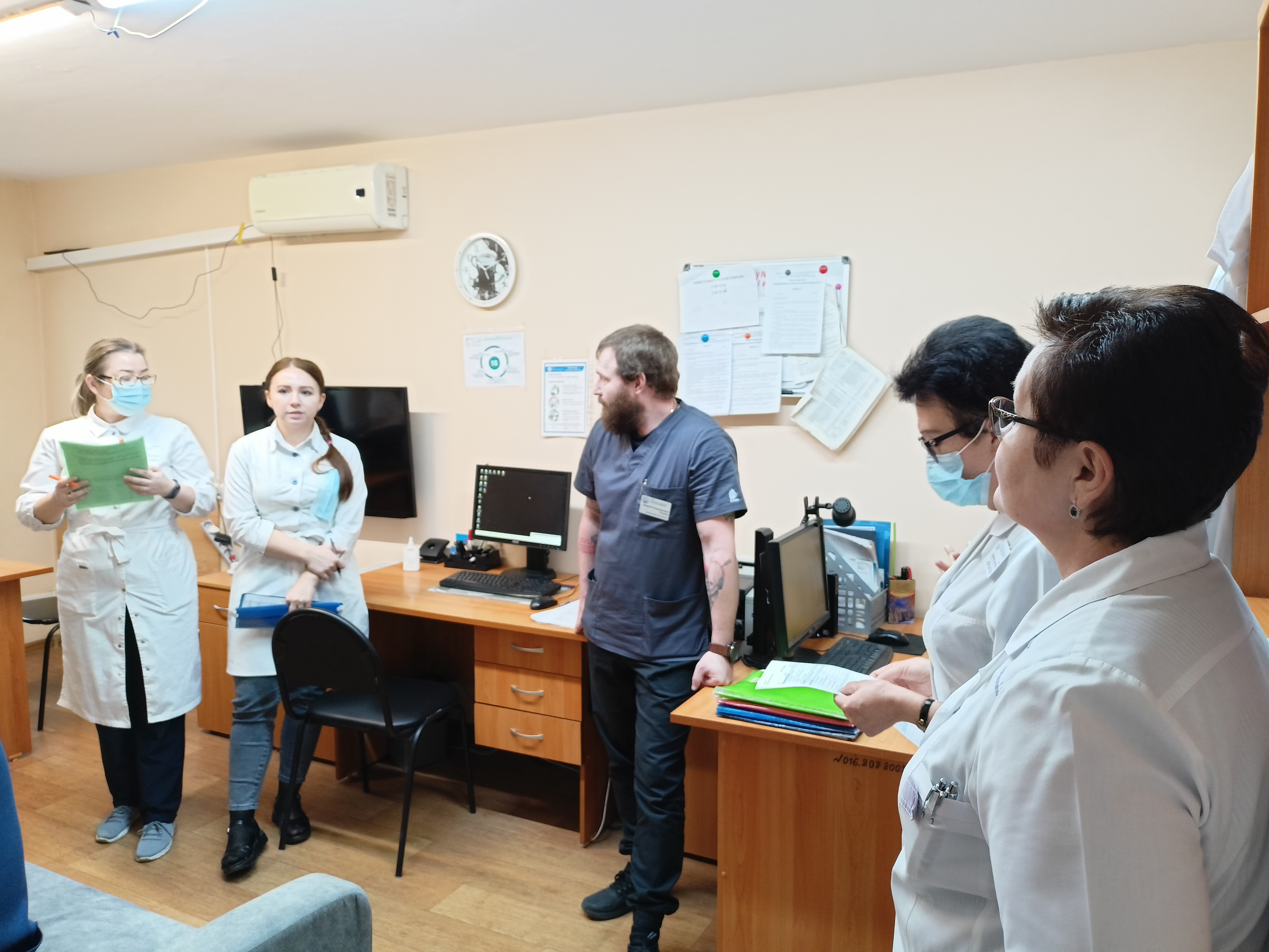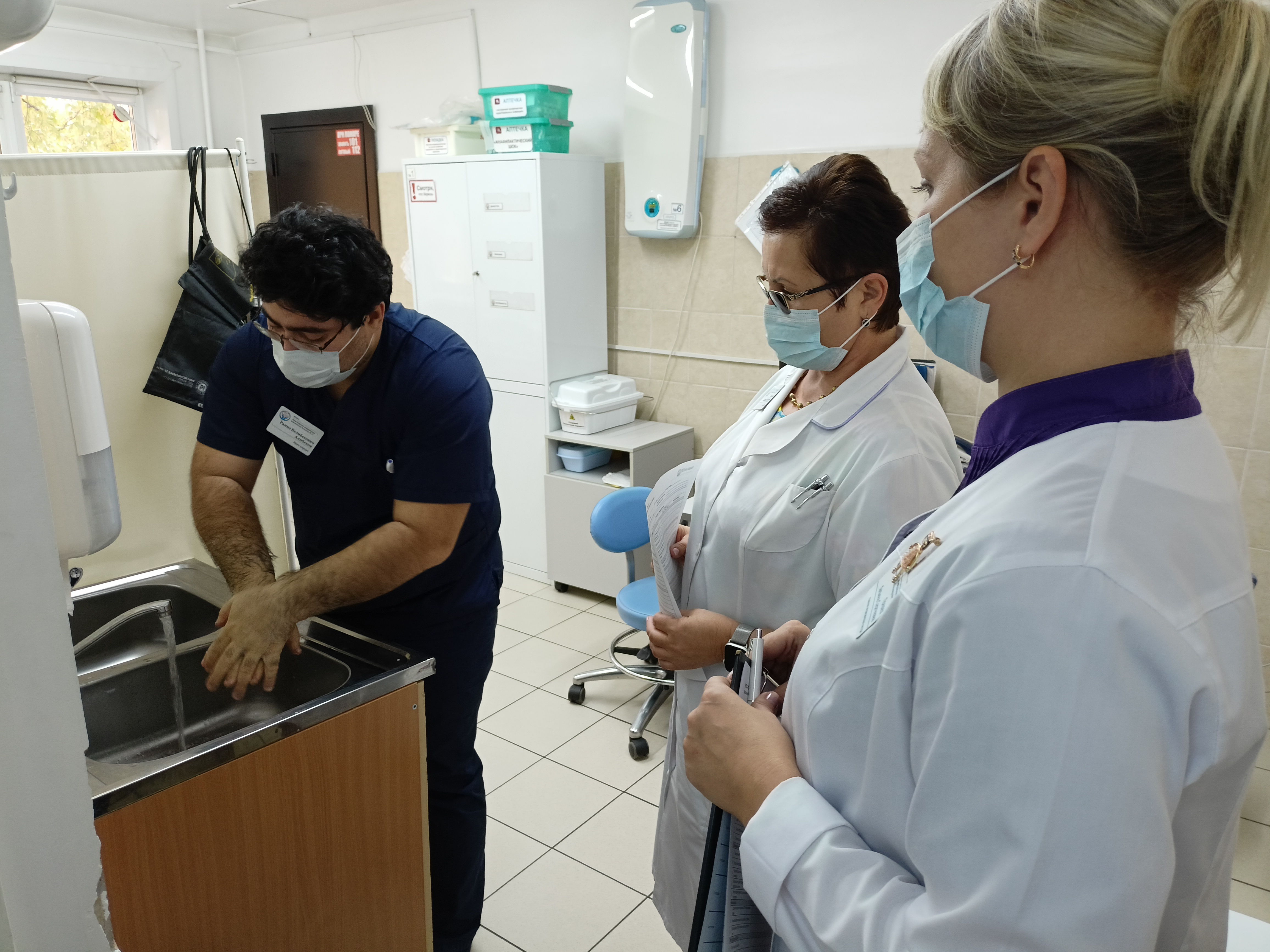 В рамках обхода особое внимание руководство больницы уделяет эпидемиологической безопасности. Сотрудники демонстрируют знания алгоритмов обработки рук, надеванию/снятию перчаток и маски.