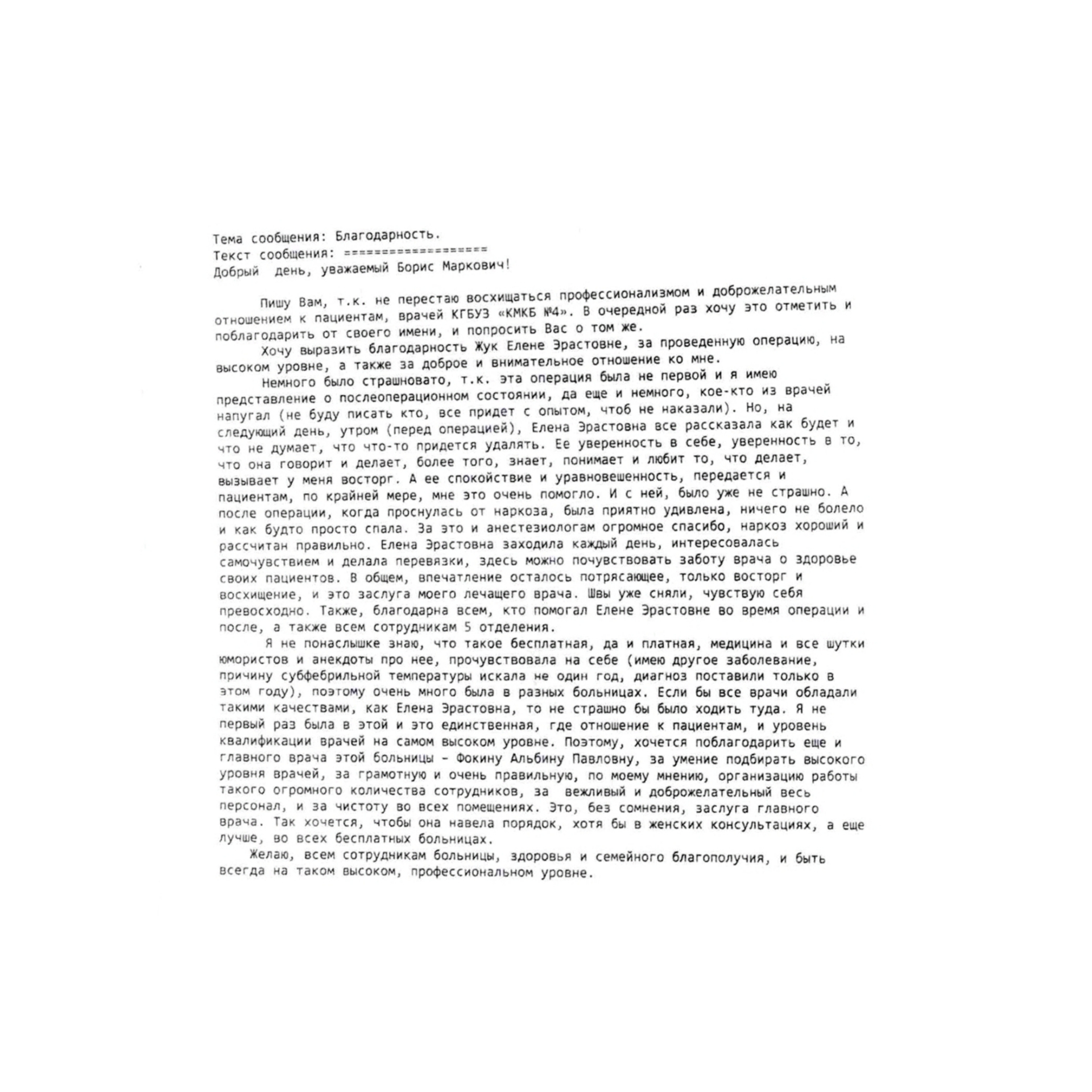 Сегодня мы получили благодарность от пациентки 5-го гинекологического отделения в адрес лечащего врача Жук Елены Эрастовны, всего персонала отделения, а также главного врача КГБУЗ "КМКБ № 4" Альбины Павловны Фокиной. Пациентка поблагодарила врача за высокий профессионализм, персонал за доброжелательное отношение, а главного врача - за отлично организованную работу медицинского учреждения. Благодарность была отправлена через сайт Министерства Здравоохранения Красноярского края, чтобы работу нашей больницы отметили на высоком уровне.