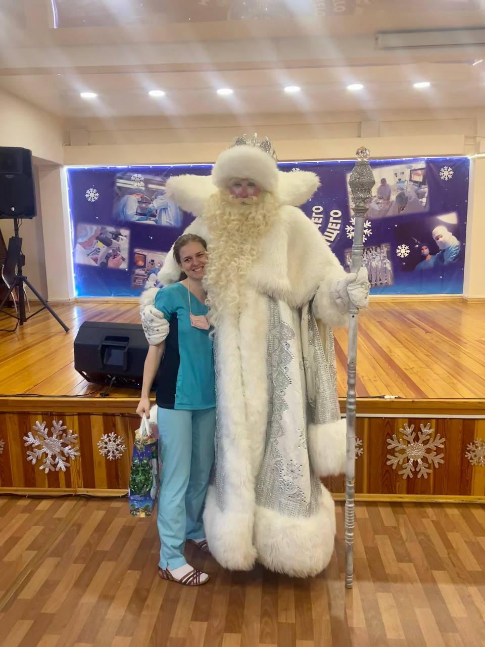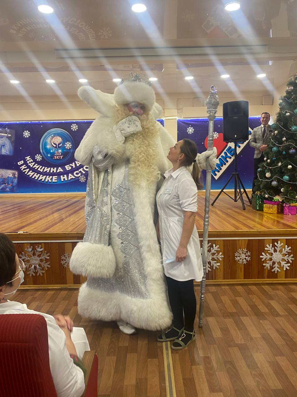 Ровно в 8:30 большой актовый зал наполнился новогодней атмосферой и предвкушением праздника. Главный врач Альбина Павловна Фокина тепло поздравила сотрудников больницы и вручила награды отделениям, которые в этом году отличились особо преданным отношением к работе.