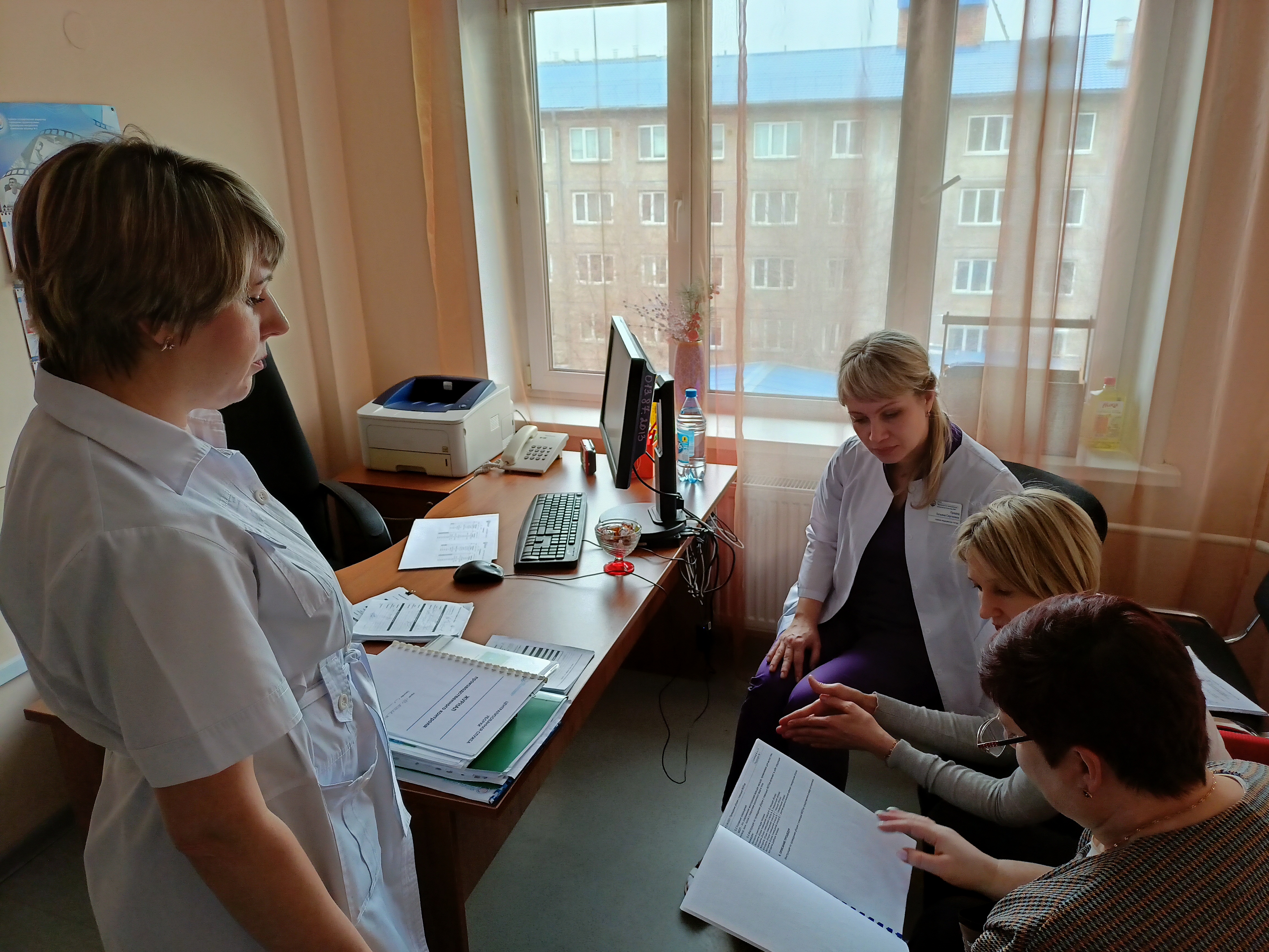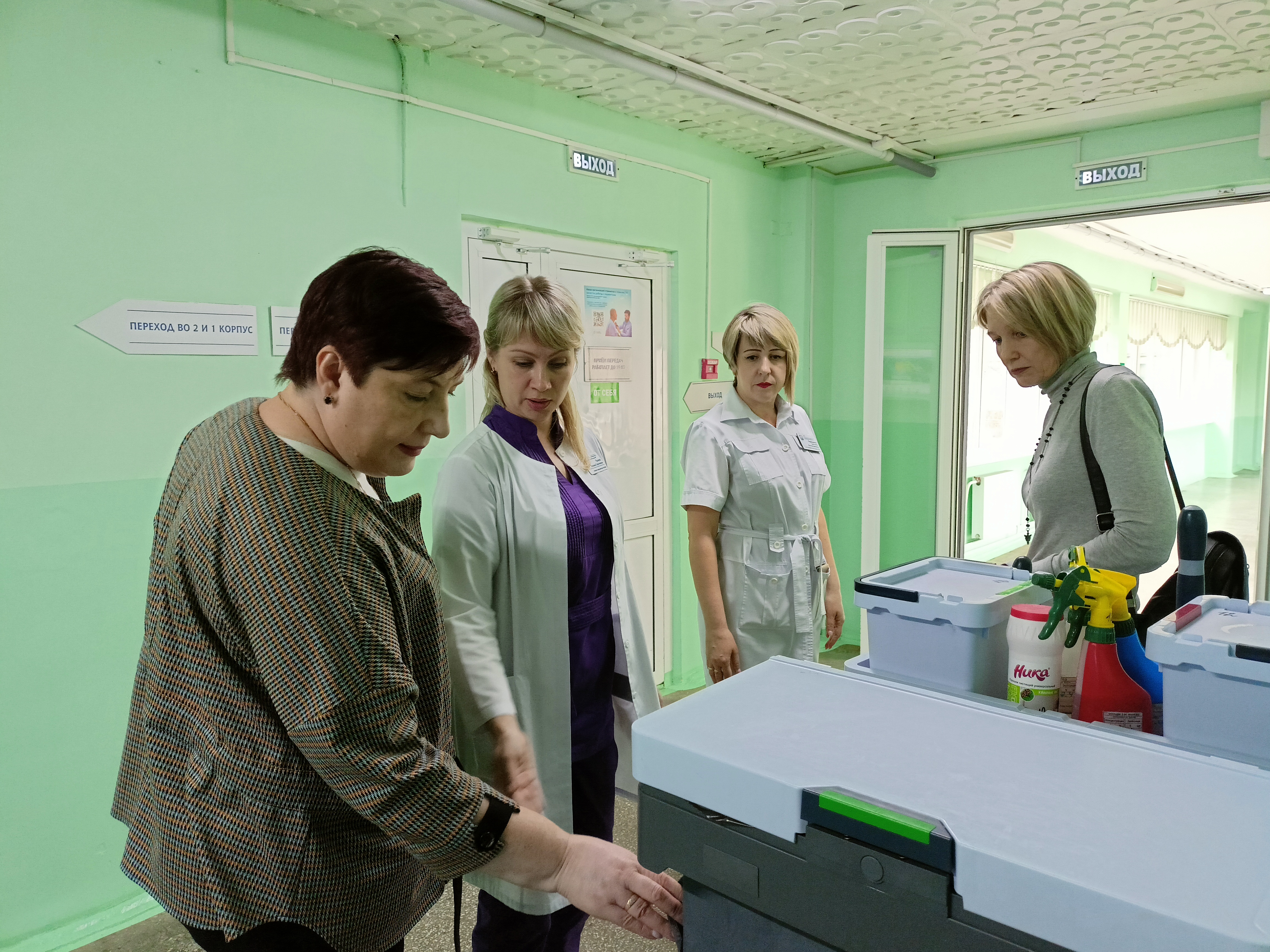 Вчера, 10 апреля, мы познакомили коллег из Новокузнецка с современным подходом в организации уборки помещении КГБУЗ «КМКБ № 4». Главная медицинская сестра и врач-эпидемиолог Новокузнецкой городской клинической больницы посетили оборудованные помещения Централизованной службы уборки (ЦСУ) и на деле убедились в удобстве, эффективности и безопасности безведерной уборки методом предварительной подготовки МОПов. Экскурсию по отделению провели заведующая ЦСУ Светлана Чернышова и главная медицинская сестра Татьяна Прадед. Коллеги с интересом задавали вопросы о дез.средствах, температурном режиме стирки, особенностях сушки и хранении инвентаря. Кроме специально оборудованных помещений, вниманию гостей были представлены разработанная совместно с отделом СМК инструкция для персонала клининга, маршрутные листы, технологические карты и чек-листы для контроля качества уборки.