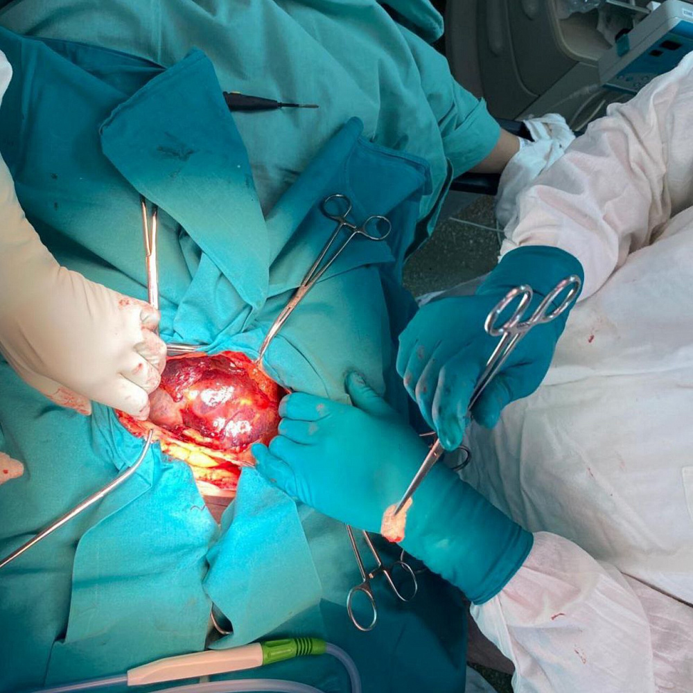 После подготовки пациентке произведена нижнесрединная лапаротомия. В ходе операции при ревизии брюшной полости обнаружено: левые придатки представлены плодовместилищем. Вес извлечённого плода составил 370 гр., а длина 25 см. Левые придатки были удалены из-за отсутствия здоровой ткани. Операция прошла без технических трудностей. В состав операционной бригады вошли врачи-акушеры-гинекологи, врачи-хирурги, также были приглашены сосудистые хирурги из Краевой клинической больницы № 1.