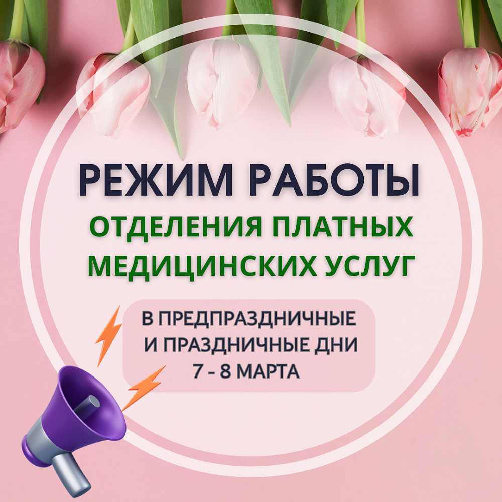 В следующие выходные нас ждёт прекрасный праздник - Международный женский день. В связи с этим режим работы отделения платных медицинских услуг будет изменён.