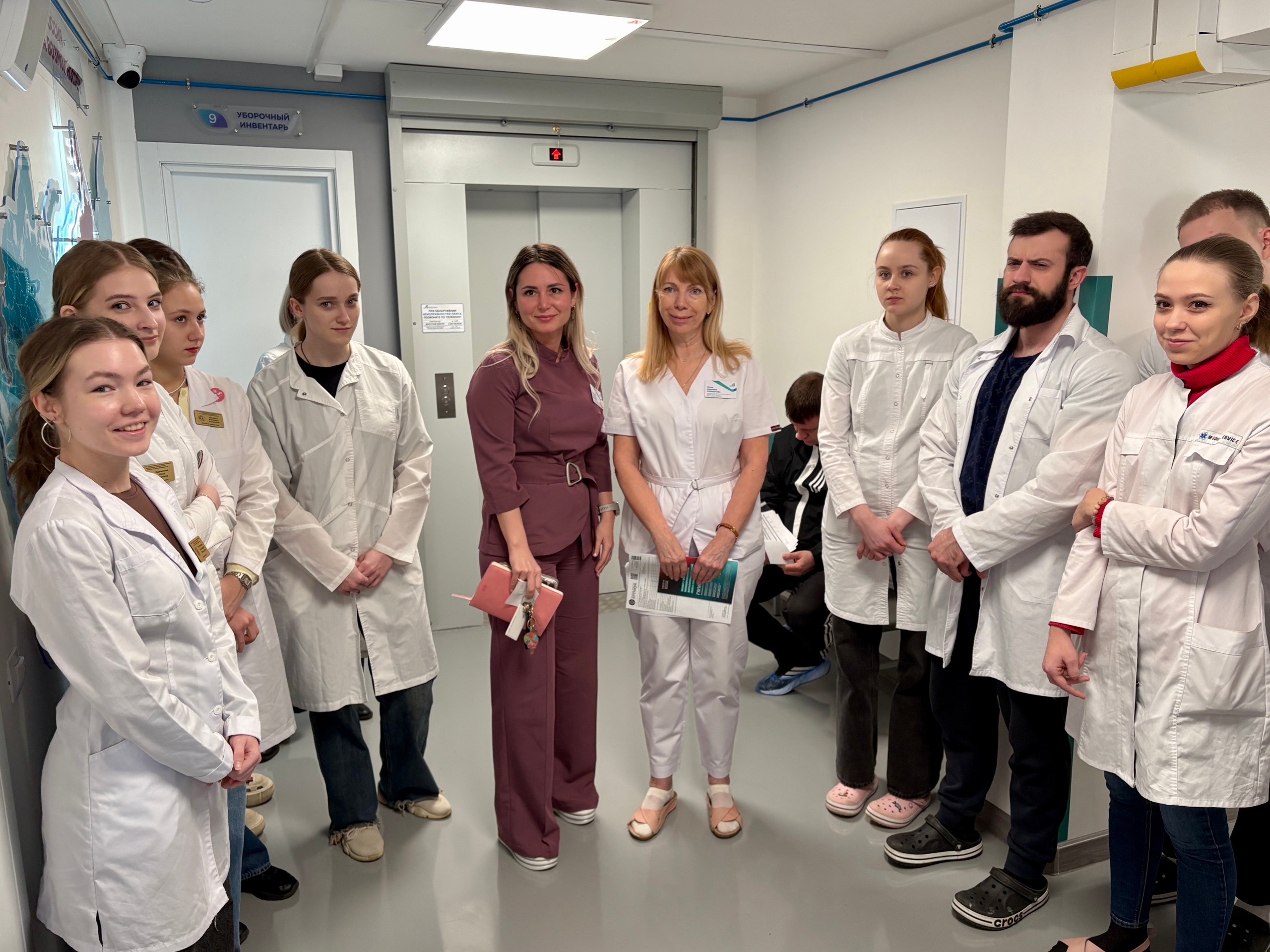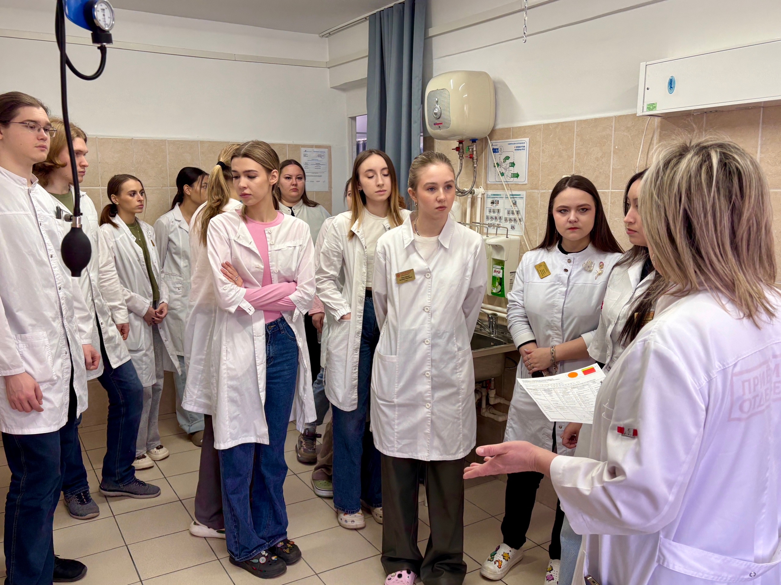 Студенты разделились на несколько групп, чтобы не создавать помех лечебному процессу. В сопровождении старшей медицинской сестры Оксаны Викторовой группы посетили приёмное отделение, где будущим врачам подробно рассказали о системе сортировки экстренных пациентов и цветовой навигации. Ребятам показали зоны ожидания для пациентов, противошоковый зал, смотровые и процедурные кабинеты.